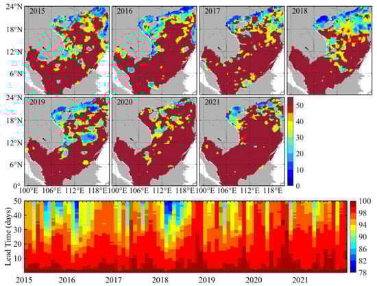 Next, the forecast skill horizon on which the RMSE crosses the monthly mean climatology is identified for each grid and each month. Then, the composite map of the forecast skill horizon for the entire SCS basin for each year from 2015 to 2021 is obtained by keeping the least forecast skill horizon for each grid among 12 months in that year and plotted in the top and middle panels of Figure 8. Meanwhile, the numbers of grids with the monthly mean RMSE of the model forecasts smaller than the corresponding monthly mean climatology are derived at lead times of 1–50 days for the period 2015–2021. The frequencies characterizing the proportion of these grid numbers of the entire SCS basin for each month during the period 2015–2021 are shown in the bottom panel of Figure 8.