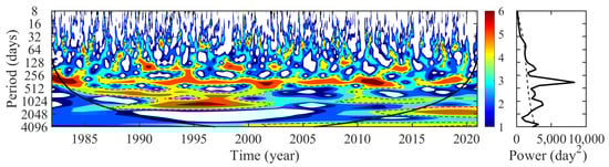 The forecast skill horizon in terms of ACC for the daily SCS forecast of the model exhibits prominent features with multiple time scales (Figure 5c). In light of this, we focus more on the ACC next. To find dominant temporal modes of variability associated with the forecast skill horizon, we obtain the wavelet power spectrum [] for the time series of the forecast skill horizon determined by the ACC threshold of 0.6 for each individual daily SCS forecast during the period 1982–2021 (Figure 9, left panel). Here, we employ the complete SSTA time series, not just the testing sub-dataset, so that longer time-scale features embedded in the forecast skill horizon can be extracted. Global wavelet spectrum (Figure 9, right panel) is calculated by averaging the wavelet power spectrum over time. The most distinct peak revealed in the computed global wavelet spectrum is a sharp maximum at a period of about one year, which persists throughout almost the entire time period. Other significant peaks exceeding the 95% confidence level for a red-noise process in the computed spectrum are observed at about 60 days, six months, in the range of 2–5 years, and ≥~10 years. The wavelet power spectrum (Figure 9, left panel) is clearly nonstationary in these period bands. Next, we perform preliminary explorations to try to relate these significant wavelet peaks to various regional and global coupled air–sea phenomena.