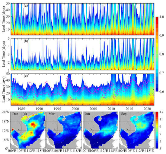 The strong annual maximum revealed in the computed global wavelet spectrum is associated with the fact that the forecast skill horizon tends to be longer and out to 50 days in most cases during the winter months for the period 1982–2021 as illustrated by the monthly mean ACCs of the daily SCS SSTA forecasts produced by the model (Figure 10a). As has been demonstrated in Figure 6, a good correlation (>66%) is found between the daily ACCs in the forecasts of the BP model and persistence (blue dashed line) at lead times shorter than ~5 days. And this conclusion still holds for the monthly ACCs by comparing Figure 10a,b, in which the monthly ACCs for persistence at lead times of 1–5 days are displayed. Such annual phasing of inter-annual SSTA strong persistence is consistent with the fact that the temporal persistence of the SCS SSTAs is seasonally varying, which is the greatest in winter (Figure 10d). It may be due to, as explained in [], that the winter SSTAs that persisted at depth below the shallow mixed layer during the summer months become re-entrained into the mixed layer during the following winter.