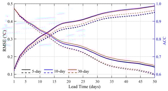 RMSE reflects the stability of the forecast model and ME can directly reflect the average deviation but may result in a situation where positive and negative values cancel out. Therefore, we also use MAE for comprehensive assessment. As a common rule of thumb used within the European Centre for Medium-Range Weather Forecasts [], the skill in the positioning of synoptic-scale features ceases to have value for general predicting purposes where the ACC value falls below 0.6. In view of this, the forecast skill horizon in this study is defined as the lead time when the daily SSTA forecast ceases to be more skillful than the climatology [,] and the ACC value falls below 0.6. An ACC value of 0.6 is hereinafter referred to as the ACC threshold. We then use the results from the forecasting experiments for producing 50-day forecasts, initialized daily from 2015 to 2021, to evaluate the performances of these three hybrid models.