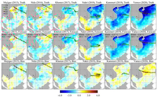 Six out of the 65 TCs passing over the SCS were classified as typhoons. They are used to examine the performance of the model when the forecast skill horizon is out to 50 days. For each of these six typhoon cases, the SST changes on the day when the typhoon reaches its peak intensity and is calculated over the 50-day forecast window for the truth and forecast. As shown in the bottom panels of Figure 12, the bias in the SSTA forecast is not evident during the passage of the typhoon except for Nakri (2019), with both the RMSE (0.66 °C) and ACC (0.79) of the SCS SSTA forecasts being the maximum among the six typhoon cases.
