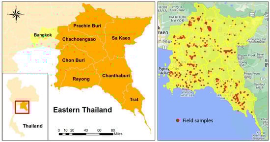 The study area of Eastern Thailand, which consists of seven provinces: Chachoengsao, Chanthaburi, Chon Buri, Prachin Buri, Rayong, Sa Kaeo, and Trat. The Thai names in the backdrop image on the right figure represent locations and do not affect interpretation of field samples.