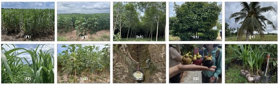 (f1) A sugarcane plantation; (f2) sugarcane; (g1) a cassava plantation; (g2) young cassava; (h1) a rubber plantation; (h2) a rubber tree that has been harvested for latex; (i1) a mangosteen tree; (i2) mangosteen; (j1) a coconut tree; and (j2) coconut seedlings.