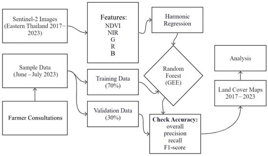 We designed a two-layer classification scheme, in which the first layer had broad land cover types, including agriculture, urban, water, (natural) forest, grass/shrub, and bare ground. The second layer included detailed crop types in the land cover—agriculture, i.e., durian, rice, rubber, eucalyptus, oil palm, pineapple, sugarcane, cassava, mangosteen, coconut, and others. To improve accuracy and map clarity, we focused the classification system on the crops that were both pivotal to the Thai economy and were abundant in the area. Some of the less recurrent crops such as corn, mango, and banana were included in the ‘others’ class. For the selection of major crop types in the region, we also referenced the official document ‘Agricultural Statistics of Thailand’ as developed by the Thai Office of Agricultural Economics [].
