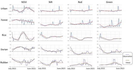 Sample time series observations and the corresponding fitted curves using harmonic regression for urban, forest, rice, durian, and rubber pixels.