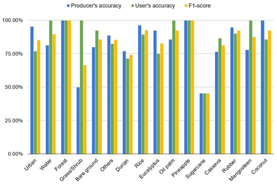 Mapping accuracies varied across crop types are shown in Figure 7. In general, the majority of crop types reached over 75% of the producers’ and the users’ accuracy. Particularly for rice, rubber, pineapple, oil palm, and coconut, the accuracies were above 90%. An exception was sugarcane, whose accuracy was lower than 50% of producers’/users’ accuracy. Due to the nature of sugarcane as a species of tall, perennial or semi-perennial grass, it was easily misclassified as grass/shrub or other early-stage plantation with ground surface covered by grass of similar phenological traits.