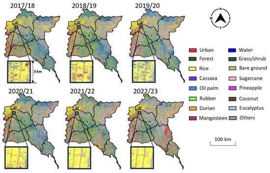 More than three years into the COVID-19 pandemic, the UN World Health Organization (WHO) officially declared an end to this global health emergency on 5 May 2023 []. Over the past years, the immediate impact of the pandemic on the agricultural system has been confirmed in a number of studies, including the loss of the workforce due to infection or quarantine [], shortages of cultivation supplies [], restricted transportation and trade [,], and disruptions to retail business []. However, the long-term impact of the crisis on agricultural systems remains to be well understood. In particular, crop cultivation is an integral part of the agricultural supply chain. While the pandemic apparently disrupted cultivation temporarily, it is unclear whether there may be a slow recovery or a permanent change in the cultivation landscape (e.g., crop acreage and types) during and after the pandemic. Understanding the landscape change of crop cultivation is especially critical for Thailand, whose agricultural sector contributed over 8% to the nation’s gross domestic product (GDP), employed about 30% of the total workforce, and played a key role in providing financial support to 6.4 million households []. Thailand’s agriculture not only affects its domestic economy but also has a major influence on the global market. As a world-leading food exporter, Thailand’s trade in agricultural products totaled 1.55 trillion baht (~43 billion USD) in 2022, with major markets including China, Japan, India, South Korea, Australia, New Zealand, Peru, and ASEAN (Association of Southeast Asian Nations) members [].