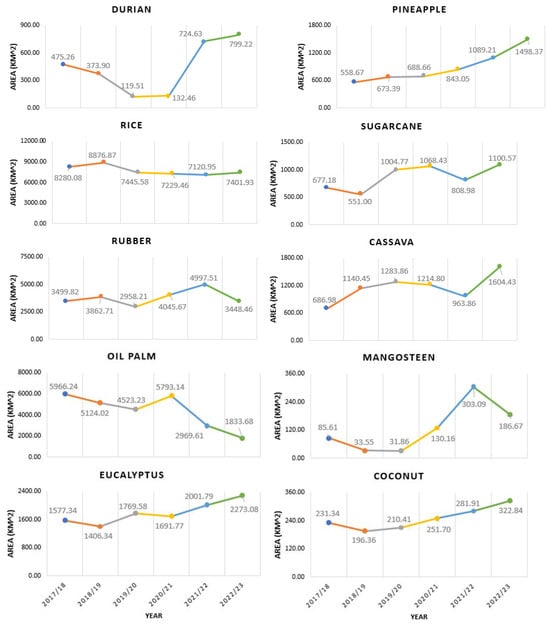 In our study area, rice cultivation was primarily concentrated in the northern regions, specifically within three provinces: Chachoengsao, Prachin Buri, and Sa Kaeo. While the cultivation of rice remained consistent in this area over the years, both its spatial coverage and density experienced a gradual decline. Regarding tree plantations, rubber trees were extensively distributed throughout the study area, particularly in Chachoengsao, Chanthaburi, Rayong, Chon Buri, and Trat. Although the spatial coverage of rubber plantations exhibited fluctuations during the study period, the overall spatial pattern remained relatively stable. In contrast, the spatial distribution of durian plantations presented a distinct pattern. Particularly noteworthy is the significant increase in durian plantation coverage observed in Rayong, Chanthaburi, and Trat provinces since 2022. Given that durian trees typically require 3–6 years to mature and produce fruit, it is plausible that the surge in durian cultivation began several years prior to being accurately captured by remote sensing. This phenomenon may also elucidate some spatial inconsistencies observed in durian plantation regions before 2022 when trees were small. Furthermore, it is worth noting that the variability in measurements of crop distribution over the years could also be influenced by atmospheric noise, a challenge often encountered in tropical regions and difficult to completely eliminate from the data.