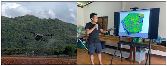 Climate change plays a crucial role in agriculture, and Thailand has witnessed a notable rise in temperatures over the last four decades, with the mean temperature escalating by 0.95 °C between 1955 and 2009 []. Specifically, during the 2019/2020 season, an abnormally brief monsoon period and a 15% reduction in annual rainfall triggered a severe drought in the country [], resulting in substantial crop yield losses. To address this, the Thai government implemented restrictions on rice irrigation []. Our findings underscore the impact of these climate challenges, revealing a 16.12% decrease in rice cultivation between 2019 and 2020. In addition to drought, irregular and intensified extreme climate events, such as hurricanes, have adversely affected the region over the past decade, as reported by local farmers in our informal communications with them. While the pandemic exacerbated these challenges, it also served as a catalyst for Thai farmers to embrace innovative technologies. For instance, some farmers have adopted drone-assisted crop management for plant health monitoring and pesticide spraying, proving its effectiveness for smallholder farming (see Figure 10).