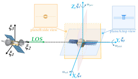 For the target in the altitude adjustment state or out of control, the three rotation components (, , and ) cause the satellite to rotate relative to the radar center. The geometry of the target relative to the radar is as shown in Figure 2, in which the pitch angle is small. In addition, coincides with , which is parallel to . As defined in Section II-A, the radar LOS is along the Y-axis. In this scenario, the angle of rotation of the target with respect to the radar is generated by a combination of orbit motion and its own rotation. When is far bigger than , the ISAR image with the target’s side view is obtained as shown in plane B in Figure 2. Otherwise, the ISAR image presents a hybrid view of the target.