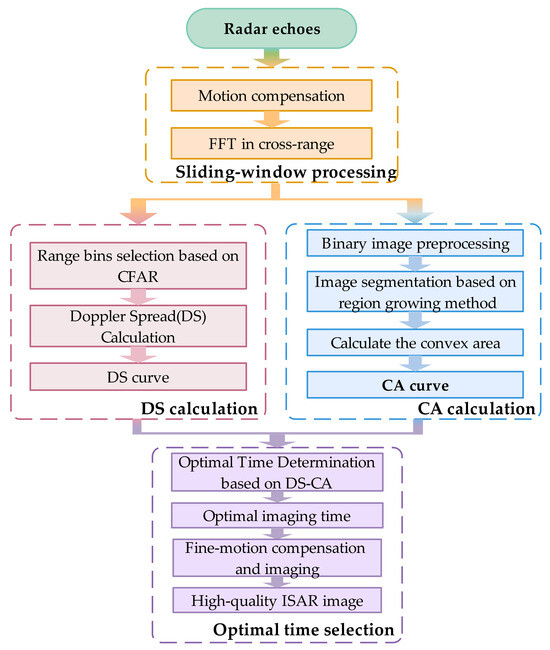 The “optimal imaging” in our proposed method is referred to as the complete representation of a certain key component and high image resolution. Figure 3 presents the flowchart of our proposed method. Firstly, the radar echoes are processed in a sliding window way, during which the motion compensation and FFT are performed in the cross-range to obtain a sequence of coarsely focused images of the target. Secondly, the DS and CA curve is obtained by the improved DS calculation and proposed CA calculation. The extreme points at which the synthetic DS-CA has relatively large values are determined and selected as the optimal imaging time instants. At last, the data around the selected imaging time are processed by finer motion compensation than those used for the initial sliding window processing, and images are formed by using PFA-LPFT [19]. The details of each step are given below.