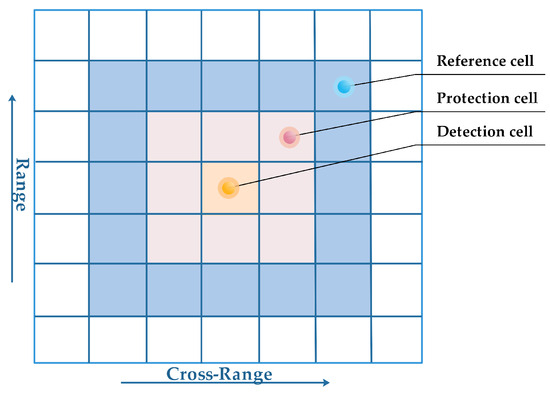 Thus, target detection is necessary to select the data containing the target. DS calculations are more accurate when using the selected data. The Cell Averaging Constant False Alarm Rate (CA-CFAR) algorithm realized the optimal detection in a uniform environment. The core of the Mean Level (ML) CFAR algorithm is to calculate the mean value of the reference cells on both sides of the detection cell as the power estimate of the background clutter [20]. To avoid the problem of power leakage, the protection cells are left between the reference cells and the detection cells, as shown in Figure 4. The CA-CFAR algorithm calculates the background clutter power estimate by averaging the reference cells on both sides.