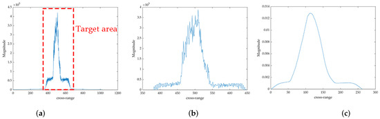 Step 3: The synthesized range envelope is shown in Figure 6a, which can be used to extract the target area by utilizing the CFAR. represents the region of greater than the threshold, which is selected to obtain the range bins occupied by the target, as shown in Figure 6b. Only the range bins in the range gate are summed up to obtain a cross-range profile for the DS calculation. Figure 6c shows the smoothed curve of Figure 6b.
