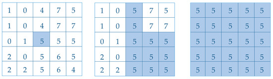 Region growth is the process of aggregating pixels or sub-regions into larger regions according to predefined criteria. The basic idea is to start with a set of growth points (the growth point can be a single pixel or a small region) and merge neighboring pixels or regions with similar properties to the growth point with the growth point. These new pixels are then treated as new growth points, and the process is repeated until there are no pixels that fulfill the conditions to be included, at which point the growth point is no longer able to grow so that a region is grown. The similarity between the growth point and the similar region can be based on the gray value, texture, color, and other image information. The schematic diagram of the region growth method is shown in Figure 7. The CA calculation is described as follows: