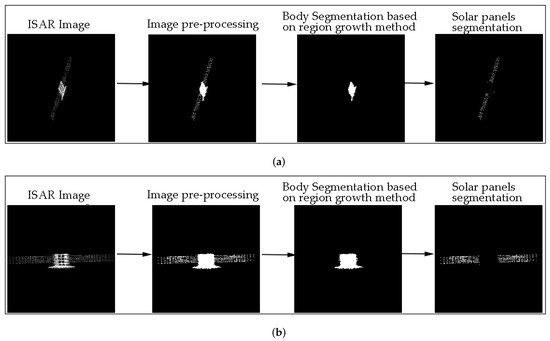 Due to the relatively strong backscattering of the spacecraft’s main body, we extract the region of solar panels by recognizing the main body and masking it. Thus, only solar panels remain in the ISAR image. Figure 8a,b show the two segmentation processes based on the region growth method under different IPPs. It can be seen that our method can extract the region of solar panels well.