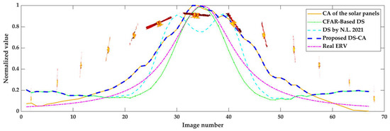 As described earlier in Figure 3, the radar echoes are processed in a sliding window way, during which the echoes are processed every 4096 pulses in sequence with an overlapping of 2048 pulses. The DS and CA are calculated for each image obtained, as shown in Figure 11. The yellow solid line shows the CA variation in the solar panels. The green dash–dot line shows the CFAR-based DS result. The result of the DS estimated by [11] and the proposed DS-CA method are shown by the cyan dashed line and blue dashed line, respectively. The real ERV is shown by the red dash–dot line. As shown in Figure 11, we also insert some of the ISAR images obtained by the sliding window operation, from which the DS and CA are calculated. By this presentation, the reason for the DS and CA change is visually shown.
