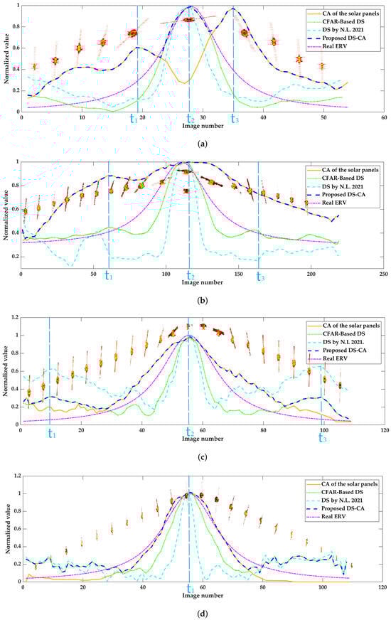 The DS and CA are calculated for each image obtained in the four scenarios, as shown in Figure 12a–d. In Figure 12, the comparison of the green dash–dot line with the cyan dashed line verifies the superiority of the CFAR-based DS method. From the green dash–dot line and yellow solid line, we see that the DS and CA curves have different variations. The co-maximization of the DS and CA is necessary to select the optimal time in these scenarios.