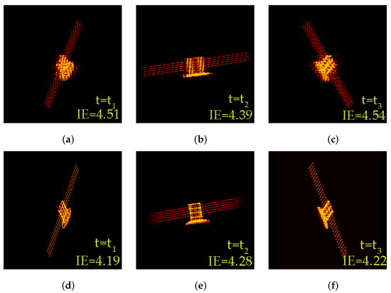 The IPPs in Figure 12b present mixed views of the satellite, during which the image resolution gradually increases and then decreases. According to the DS method, is selected as the optimal imaging time. As for our proposed method, the extreme points , , and of the synthesized DS-CA curve are selected as the optimal imaging time. The images corresponding to , , and are presented in Figure 14a–c. The images obtained after fine motion compensation are presented in Figure 14d–f. The images after fine motion compensation show that the shape of the target and the components are much clearer. Comparing Figure 14d,f with Figure 14e, we see that the ISAR images at and have already presented the main feature of the solar panels, but with a lower DS due to the altitude. Thus, more appropriate imaging intervals can be determined by our proposed method, which can provide more images for subsequent target identification and measurement to improve accuracy.