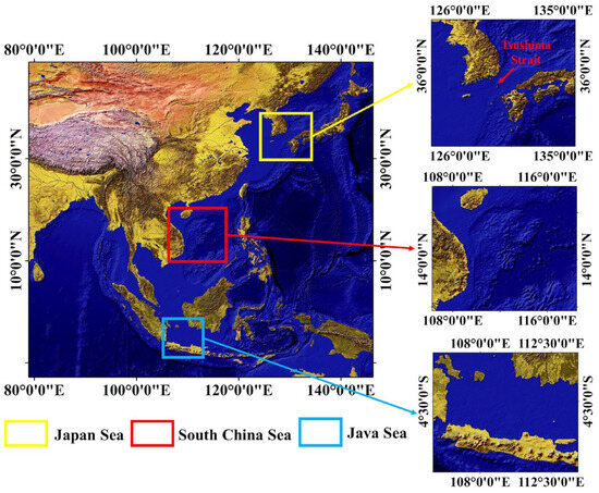 Location of the study area (the yellow, red, and blue boxes represent the Japan Sea, South China Sea, and Java Sea, respectively).