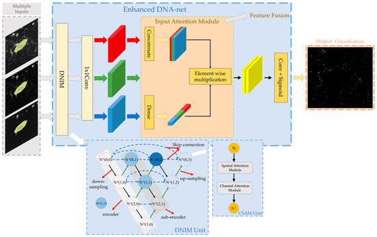 Most single-input networks are built upon a direct and simple one-to-one mapping relationship, such as CNN and Fast R-CNN [38,39]. Existing studies on detecting night-time illuminated vessels using deep learning mostly involve processing one input image at a time [40,41]. However, due to the minimal number of pixels occupied by the target vessels, lack of prominent texture features, and limited spectral information, feature extraction is challenging in a single-input scenario. Consequently, we propose a multi-input network structure to better integrate information from multiple input images, including pre-processed DNB (sDNB), spike median index (SMI), and spike height index (SHI) images. The structure of the network structure is shown in Figure 2, which is composed of the multiple-inputs part based on night-time remote sensing images and Enhanced DNA-net including feature extraction and fusion from multiple inputs and the final classification prediction results. Features from each single input are extracted by Dense Nested Interactive Module (DNIM) [18], which contains a paradigm that facilitates the feature interaction between each feature node and CSAM unit that enhances the features from each node. For each single input, the multi-layer features extracted by DNIM are up-sampled and concatenated, and then fused into multi-layer outputs through a 1 × 1 convolutional operation. These multiple-inputs features are processed by the input attention module and activated to output classification.