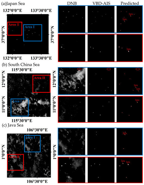 Moreover, despite the cloud contamination in the observation time of the study area (Figure 3b,c), the detection of lighted vessels still shows a relatively high accuracy. It is important to mention that the illuminated point on the raw DNB imagery of area I in Figure 3b (highlighted by a red circle), which is identified by VBD-AIS as a non-vessel target and possibly is the gas flare on the sea, is also regarded as a non-vessel target by our method. This further confirms that our method can, to some extent, filter out other illuminated targets at sea that are not vessels.