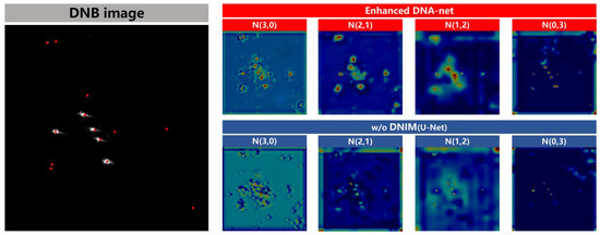 To observe how DNIM maintains information about small vessel targets in deep feature layers, the processing is visualized. For each layer’s feature map in DNIM, all the feature layers are added and normalized to visualize the thermal map in our single-input network (sDNB). To achieve better visualization, in the sDNB (DNA-net) with the most abundant semantic information, N(3,0), N(2,1), and N(1,2) are up-sampled to the same size as N(0,3). As shown in Figure 4, in comparison to Enhanced DNA-net, small targets are lost in the feature maps of the deep layer in Enhanced DNA-net with U-Net.