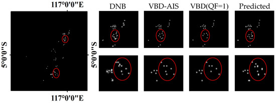 To better demonstrate how the proposed Enhanced DNA-net achieves equal to or slightly higher accuracy than VBD (QF = 1) in identifying lighted vessels using NTL imagery, we present the recognition results of Enhanced DNA-net and VBD (QF = 1) on the DNB image of Java Sea on 2 November 2022 (Figure 5).