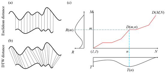 The Euclidean distance was conventionally used to gauge the similarity between two time series, which was achieved by calculating the cumulative distances of corresponding points across both series [36]. Nonetheless, as illustrated in Figure 1a, if two time series display similar overall shapes but are offset along the time axis, then using the Euclidean distance as a similarity measure might significantly bias the results. An effective alternative to this problematic approach was the use of the DTW method, which enhanced the alignment of the two time series by warping the time axis (Figure 1b) [37]. The process of determining the DTW distance involved warping the time axis to identify the minimal distance between the two time series, thereby establishing an optimal correspondence for each point pair across the time series [30]. The algorithm aimed to find the best possible pathway from the starting point to the ending point. This pathway traversed through various alignment points, aiming to minimize the cumulative distortion across its length (Figure 1c) [31,38]. The DTW algorithm was implemented as follows: suppose time series and , with lengths of m and n, respectively, where m may not be equal to n. By sorting them based on their time positions, a matrix of the size of was constructed, with each element denoted as . In the matrix , a set of adjacent elements was referred to as a warping path, denoted as , where the kth element of the path satisfies the following conditions: