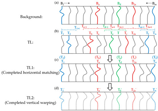 TL-GPR image alignment procedure. The red line represents the marker A-scans (i.e., marker traces), the green line represents the non-marker A-scans between the marker A-scans, and the blue line represents the non-marker A-scans at the beginning and end of a survey transect. (a) and (b) are the background image (as background) and TL image (as TL), respectively; (c) Using the DTW algorithm, the marker and non-marker A-scans are matched successively to solve the problem of inconsistent counts and mis-corresponding A-scans. For example, if the marker A-scan in the Background corresponds to in the TL image, is replaced by . The resulting new image is called TL1; (d) The time offset problem is solved by using the DTW algorithm to warp or overall translation the corresponding A-scans in TL using the A-scans in Background as the standard. The new image obtained was called TL2. At this point, the TL image alignment process is completed.