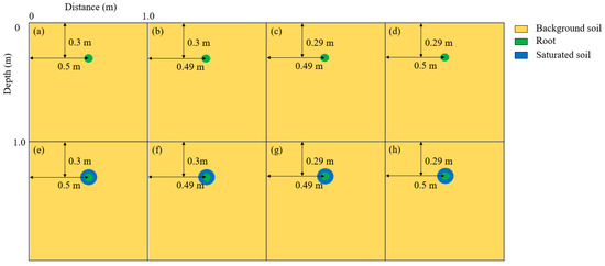 Simple single-root geometric mismatch scenario forward modeling setting—only all possible offsets for a single root with a geometric offset distance of 0.01 m are shown. (a) The initial situation; (b–d) All possible offset scenarios that might occur for a single root with a geometric offset distance of 0.01 m in Simulation 1 (solely geometric mismatch); (e) The ideal situation after the occurrence of subsurface lateral flow; (f–h) All possible offset scenarios that could occur after the occurrence of subsurface lateral flow with a geometric offset distance of 0.01 m in Simulation 2 (which entails both geometric mismatch and real signal variations).
