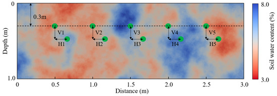 To evaluate and corroborate the efficacy of the proposed alignment method, we established simple, single-root geometric mismatch scenarios, as well as more intricate multiple-root geometric mismatch scenarios. The software, gprMax V3.0, was employed to simulate ideal conditions, where the void space between roots and soil can act as the pathways of subsurface lateral flow. By shifting the geometric position of reflectors (e.g., root or root soil composite) within the simulation domain, the simulation was conducted to mimic the geometric mismatch occurring in the TL-GPR data acquisition. For each scenario, two different situations were simulated: the first encompassed solely geometric mismatch (hereafter referred to as Simulation 1), and the second combined geometric mismatch with real soil water content changes (hereafter referred to as Simulation 2). Simulation 1 represented the scenario with geometric mismatch alone, while Simulation 2 built upon Simulation 1 by introducing additional real signal variations. The forward simulation results for both the single-root and multiple-root scenarios were then registered to verify the effectiveness of TLIAM–DTW. According to Guo et al. [16], the maximum geometric offset in space was determined to be 0.05 m. To assess the reliability of the image alignment method in aligning TL images, ideal results without any geometric mismatch were simulated for both scenarios.