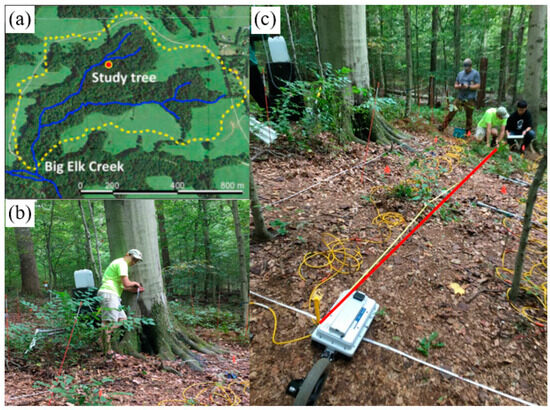(a) An overview of the Fair Hill Catchment, showing drainage boundaries (indicated by the yellow dashed lines) and the location of the sample tree; (b) Water was released onto the tree trunk through PVC tubing to represent the stemflow process; (c) A photo of the geophysical survey area, showing the antenna of the GPR system (the white box) and its moving path (indicated by the red solid line).