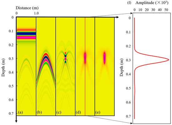 An example of GPR data preprocessing effect: (a) Raw data from the forward simulation results of Figure 3a obtained by gprMax V3.0 (the settings are described in Section 2.2.1 above) and the hyperbolic reflections representing the root reflectors; (b) Some radargram processed in Reflexw 9.5 software with first arrival time extraction and background noise removal were used to improve the signal-to-noise ratio. The velocity analysis was then performed and the time–depth conversion was completed; (c) Kirchoff migration was used to trace hyperbola reflections back to their sources; (d) Hilbert transformation was used to express the magnitude of signals, elucidate subtle objects and reduce multiple reflections; (e) Moving average filter was used to eliminate the influence of geometric mismatch; (f) A graph of the A-scan obtained after the Hilbert transformation—at this point, only the amplitude values symbolizing the signal strength could be represented.