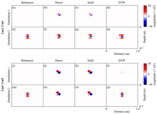 For Simulation 1 (Figure 7a–d,i–l), where no true signal variations exist under the ideal condition of no geometric mismatch, the GPR detection results along the same profile at different times should remain consistent. Therefore, the differential results between the images at different times and the background image should be zero, shown as “Reference”. However, when a geometric mismatch problem occurs, regardless of “Lm1_Um1” or “Lm5_Um5”, the “Direct” clearly shows signal discrepancies that should not be present. Furthermore, there is no significant difference between the “Direct” and “MAF”. The signal discrepancies that should not have occurred are still evident. In contrast, the “DTW” does not show significant signal discrepancies.