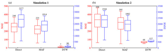 Calculating the MAE and RMSE of the “Direct”, “MAF”, and “DTW” and then comparing them to the “Reference” makes it possible to quantitatively evaluate the effectiveness of various methods for solving geometric mismatch. Based on these results, box plots were further generated for different evaluation metrics under various methods (Figure 8). From the box plots, it can be observed that, for both Simulation 1 (Figure 8a) and Simulation 2 (Figure 8b), the moving average filter only slightly reduces the impact of geometric mismatch. For Simulation 1, the MAE and RMSE decrease from 248 and 2377 to 223 and 1914, respectively. Similarly, for Simulation 2, the MAE and RMSE decreased from 336 and 2344 to 305 and 1982, respectively. However, the influence of geometric mismatch is significantly reduced after applying the TLIAM–DTW. In particular, TLIAM–DTW virtually eliminates the effect of geometric mismatch in Simulation 1: the MAE decreases from 248 to 7, reflecting a 97% decrease, while the RMSE decreases from 2377 to 90, indicating a 96% decrease. Meanwhile, the MAE in Simulation 2 drops from 336 to 68, showcasing an 80% decrease, and the RMSE decreases from 2344 to 527, representing a 78% decrease.