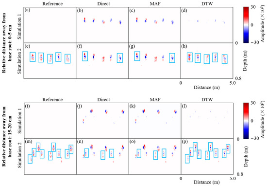 For Simulation 2 (Figure 7e–h,m–p), where true signal variations exist, the “Reference” shows a clear and neatly arranged red-blue-red alternating signal pattern. This phenomenon mainly occurs because the relative permittivity difference between saturated soil and background soil is much greater than the difference between root and background soil: as a result, the signal intensity in the TL image is stronger than in the background image. The interface between saturated soil and background soil is closer to the ground compared to the interface between roots and background soil, resulting in a shorter signal propagation time in the TL image [7]. With regard to the “Lm1_Um1” scene, the differences between “Reference”, “Direct”, and “MAF” are seen to be relatively small. However, in “Direct” and “MAF”, a horizontal offset is observed between red and blue signals, although the degree of offset is small. In contrast, “DTW” differential results show neatly arranged red-blue-red alternating signals, and there is no horizontal offset between the red and blue signals, indicating that the image alignment process successfully eliminates geometric mismatch. However, additional red signals that do not correspond to blue signals can be observed, indicating occurrences of mismatch during the horizontal matching process. With regard to “Lm5_Um5”, there is a noticeable difference between “Direct”, “MAF” and “Reference” and these results clearly show the geometric mismatch problem in the TL image; however, the “DTW” closely resembles the “Reference”, indicating a thorough resolution of the geometric mismatch problem in the TL image. Additionally, the appearance of additional red signals diminishes as the degree of geometric mismatch increases.