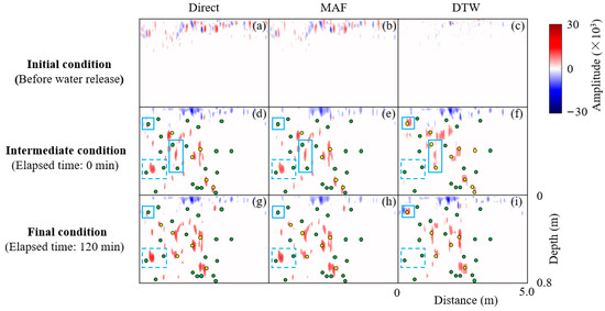 Comparison of differential results for the field measurement scenario. (a–c) represents the TL image alignment results before the infiltration experiment. (d–f,g–i) represent the TL image alignment results at 0 min and 120 min after the end of the infiltration experiment, respectively. (a,d,g) are the differential result without image alignment processing, denoted as “Direct”; (b,e,h) are the differential result with image alignment processing obtained using the moving average filter, denoted as “MAF”; (c,f,i) are the differential result with image alignment processing obtained using the TLIAM–DTW, denoted as “DTW”. The yellow dots in (d–i) refer to the lateral roots that are overlap with the isolated wetting areas (i.e., identifying the preferential flow pathways), evidencing the lateral root-derived preferential flow. The green dots in (d–i) indicate the lateral roots that do not contribute to preferential channelization. In (d–i), the solid blue boxes represent signals that are well-matched to the root system, while the dashed blue boxes indicate signals affected by geometric mismatch, which fail to connect with the root system.