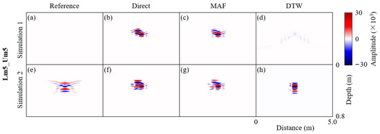 The TLIAM–DTW method works with the A-scan signal, whose shape is influenced by the preprocessing steps applied to GPR data [43]. Taking “Lm5_Um5” in the simple single-root geometric mismatch scenarios as an example, differed results of image alignment methods are obtained after using the Kirchhoff migration (without using the Hilbert transform) during data preprocessing (Figure 11). Here, without the application of the Hilbert transform during preprocessing, Kirchhoff migration leads to distinct differences. Specifically, in simulation 1 (Figure 11a–d), comparing “Reference” with “DTW” reveals that the latter substantially rectifies geometric misalignments. However, additional arcs appear around the signal, an artifact arising from subjective decisions made during hyperbolic offset parameterization in the Kirchhoff migration [44]. If set improperly, these parameters can induce pronounced errors in the processed results, complicating the interpretation of these differences.