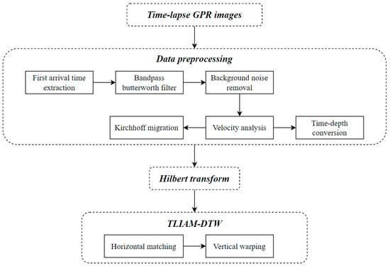 To address the issue discussed above, we propose a standard procedure for conducting the TLIAM–DTW method (Figure 12). It is important to acknowledge that the exact sequence of data preprocessing must be tailored to align with the unique attributes of the dataset at hand. Nonetheless, the overarching aim remains consistent (i.e., to eliminate extraneous clutter within the data and to enhance the signal-to-noise ratio of the GPR data). This optimization of data quality is pivotal for the successful application of the TLIAM–DTW method in achieving reliable and precise TL GPR image alignment.