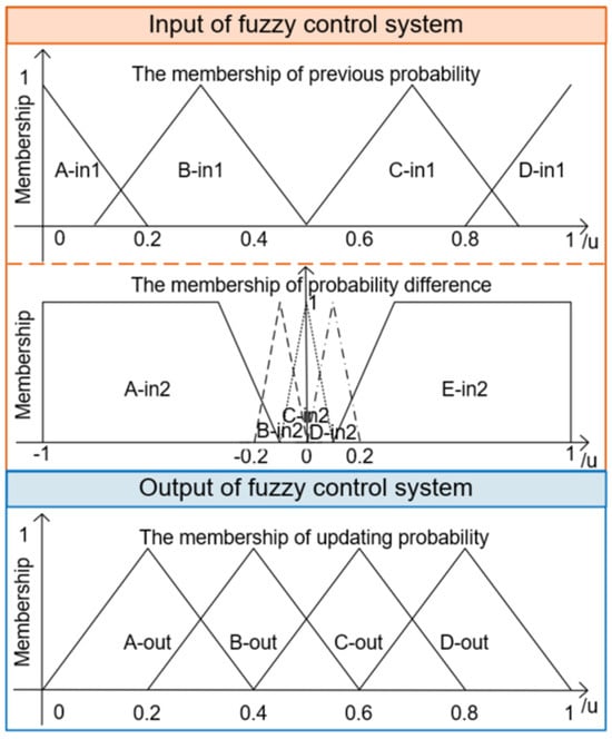 In order to further describe the workflow and data processing of the fuzzy control system, an example is presented in this paper. Assume that the current model probability is 0.4, and the previous model probability is 0.3 [30]. According to the membership function of the system input and output in Figure 2, the input of the fuzzy control system can be defined as B-in1 and D-in2; so, the system output is C-out. Taking the minimum membership degree (1 in this example), according to the centroid method, the updated model probability can be obtained as the centroid abscissa of the geometric figure, C-out, which is 0.6. All models in the model set of the ATPFC-IMM algorithm undergo probability mapping updates through the above steps, and the obtained probabilities of each model are used for the estimation fusion part of the ATPFC-IMM algorithm. The basis of the aforementioned fuzzy control system and additional rules are shown in Table 1 (Table 1 contains 20 rules for fuzzy control systems corresponding to the design of the membership function in Figure 3).