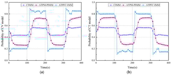 The probability transfer matrix, , is a very important factor in all types of IMM algorithms, and the setting of often depends on a priori experience. Different values may affect the tracking performance of IMM tracking algorithms. In order to investigate the effect of this factor on such IMM algorithms, a control experiment is set up and is designed in Equation (27). The other experimental parameters were the same as in the previous experiment. The model probability switching for the control experiment is shown in Figure 5.
