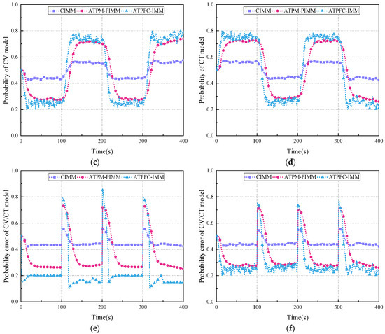 In Figure 4, the switching and probability error distribution of each model probability when the target-motion model is changed can be seen. The moments when the target-motion-state model switches are 100 s, 200 s, and 300 s, the fastest model switching is achieved by the ATPFC-IMM algorithm, followed by the ATPM-PIMM [3] algorithm, then the CIMM algorithm. And the most optimal distribution of the corresponding model probability is achieved by the ATPFC-IMM algorithm, followed by the ATPM-PIMM [3] algorithm, then the CIMM algorithm.
