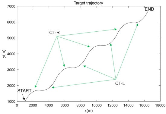 In this subsection, the target had a more complex maneuvering pattern than in Experiment 1, first making a turning motion to the right that lasted 50 s, then making a turning motion to the left that also lasted 50 s, making the two motions four times in a row for a total of 400 s. The motion trajectory of the target is shown in Figure 6.