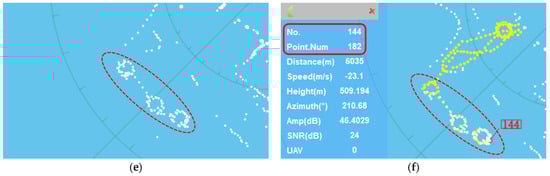 The application of the ATPFC-IMM algorithm is demonstrated in Figure 11c,d,f. In Figure 11c, the target track number is 144 and the trajectory length is 137. After the maneuver of the target, the observed trajectory is displayed in Figure 11d, with the track index still being 144, and the track length (Point.Num) increasing to 201. (The white points represent the original radar detections, while yellow points represent the target points in the trajectory). Continuous tracking is also maintained in the maneuvering area in Figure 11f. Therefore, compared to Figure 11a,b,e (the application of the CIMM algorithm), at the same time instance, this trajectory has significantly more target points, enabling the continuous tracking of the maneuvering target.