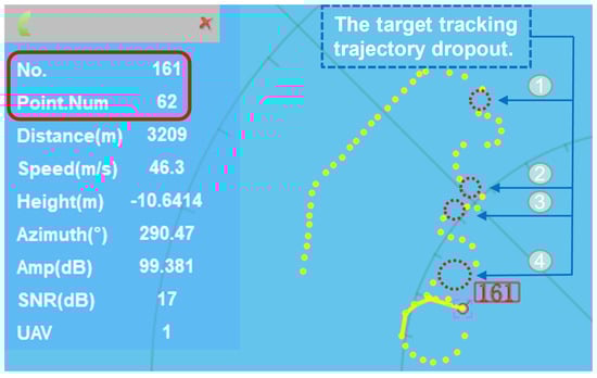 The application of the CIMM algorithm in case 2 is illustrated in Figure 12, where the track number of the maneuvering target is identified as 161, encompassing 62 target points. Additionally, it is observed that the tracking experiences point dropouts at locations with four track losses in the vicinity of target maneuvers. The intermittent loss of target tracking results in a certain level of sparsity in the overall track representation on the terminal and leads to the failure of fully capturing the continuous-turning maneuvering target.