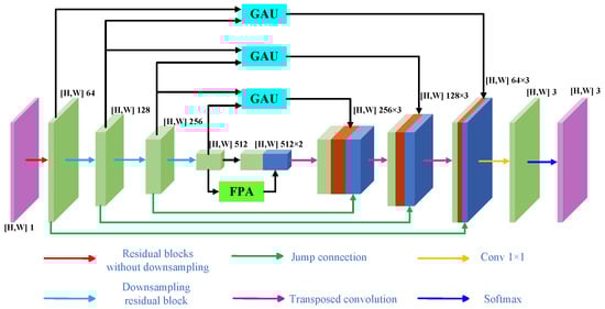 The ResDANet structure, which combines the residual structure, FPA, and GAU, is shown in Figure 4. The feature maps of the network’s downsampling module and upsampling module are of the same size, and the feature maps can be passed into the corresponding upsampling block without clipping, avoiding the feature loss caused by clipping. The bottleneck part of the connection between downsampling and upsampling uses the FPA to provide pixel-level attention for the network. The input received by each upper sampling layer comes from the output of the upper sampling layer, the output of the GAU module, and the output of the corresponding residual block. By adopting a GAU mechanism, the network mainly adds attention to shallow features through deep features, improving the quality of incoming upsampling block features to a certain extent, and it implements a skip structure similar to U-Net [] networks to enhance feature fusion. This approach combines the learning capabilities of U-Net, the deep feature extraction of ResNet, and the network structure of GAU and FPA attention mechanisms, potentially offering superior feature learning, accuracy, generalization, and robustness in phase unwrapping tasks compared to single structures or traditional methods.