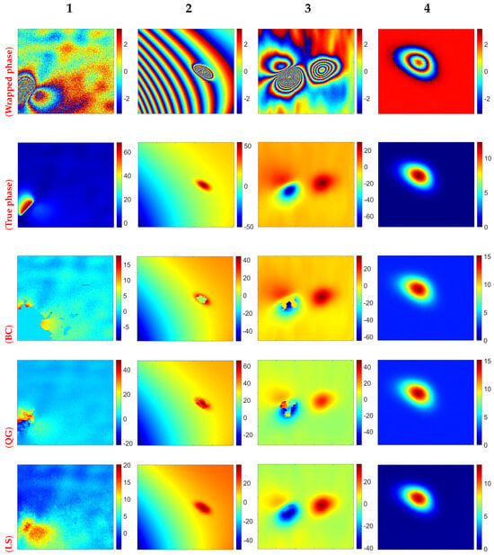 Columns 1–4 represent four different simulation images. The first row represents the wrapped phase, and the second row represents the true phase of the first row. The third to ninth rows are the unwrapped results obtained by the BC, QG, LS, MCF, RUKF, PUNet, and ResDANet methods, respectively.