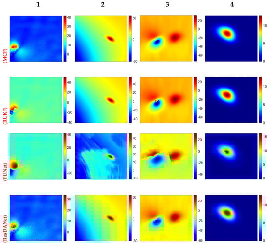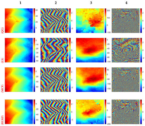 To demonstrate the performance of ResDANet, we conducted unwrapping tests on 2-D simulated data and real data. And compared with traditional algorithms such as BC [], QG [], MCF [], and LS (least squares) [] as well as methods such as RUKF [] and the neural network PUNet []. For a quantitative assessment of ResDANet-PU’s robustness, the RMSE between the unwrapped phase and the true phase along with the time required for unwrapping were employed as evaluation metrics for simulated data.