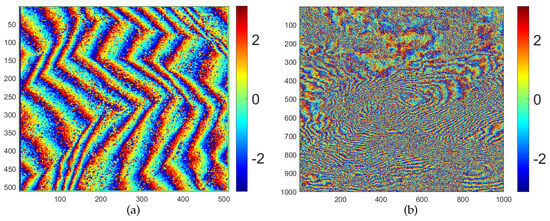 (a) The real wrapped phase of Three Gorges in China. (b) The real wrapped phase of an Italian volcano.
