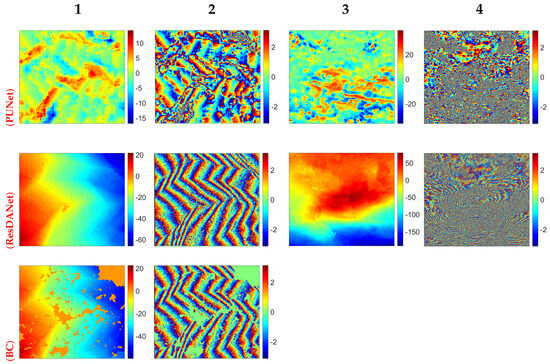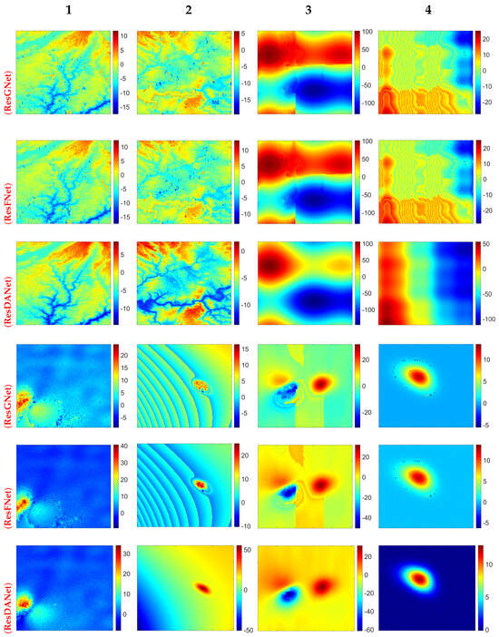 Columns 1–4 represent the four different types of data mentioned earlier. The first to third rows represent the phase unwrapping results of ResGNet, ResFNet, and ResDANet, respectively. The fourth to sixth rows represent the phase unwrapping results of ResGNet, ResFNet, and ResDANet, respectively.